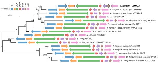 Multilocus sequence analysis (MLSA) and the maximum likelihood phylogenetic tree were constructed using genomic sequences of bifidobacterial strains obtained from the GenBank database. The B. longum LBUX23 strains identified and characterized in this study are indicated in bold font. The solid arrows represent the housekeeping genes utilized for constructing the multilocus (tlyC, cbh, glnE, pNPOx, ahpC, trxA, and trxB). The direction of the arrows reflects the orientation of these genes within the genome of each Bifidobacterium strain.