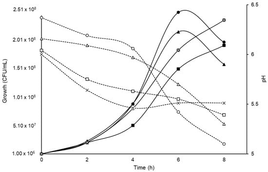 The growth kinetics were monitored for a duration of 8 h of fermentation, representing the time required for the bacteria to reach the stationary phase. TPY medium was utilized, and various substances, including lactose, sucrose, fructooligosaccharides, and lactulose, were independently added at a concentration of 1% w/v. All media were adjusted to a pH of 7 using 0.1 M NaOH (Thermo Scientific Orion 410A+, USA). Prior to sterilization, the medium was purged of oxygen by bubbling CO2. Samples were collected at regular intervals of 2 h from time zero to 8 h. The bacterial concentration was determined by the plate count method []. The pH of the supernatant was measured according to González–Vázquez et al., 2022 []. All experiments were completed in triplicate.