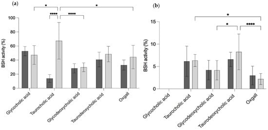 BSH activity (a) extracellular and (b) intracellular using glycol, and tauro cholic acids (primary bile salts), glycol, and tauro deoxycholic acids (secondary bile salts), and oxgall to