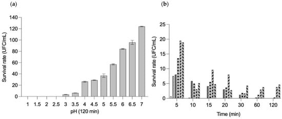 The survival rate of the percentage of survivors of B. longum LBUX23 (a) in different pH’s for 120 min (b) at different pH’s: