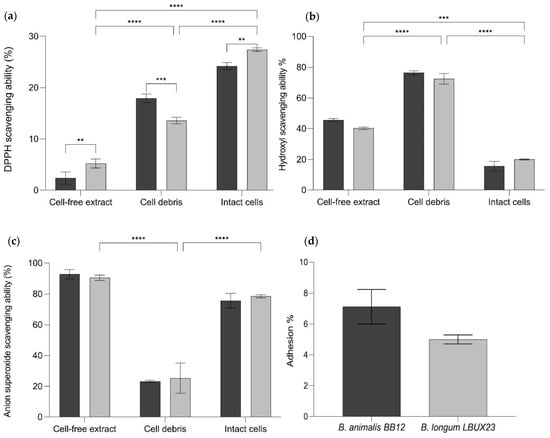 In this study, we showed that B. longum LBUX23 and B. animalis Bb-12 could inhibit superoxide anion radicals (Figure 5c). B. longum LBUX23 showed more activity in cell debris (25.3%) and intact cells (78.6%) in comparison to B. animalis Bb-12 (23.2 and 75.6%, respectively). In the case of cell-free extract, higher activity was found in B. animalis Bb-12 (92.8%) than in B. longum LBUX23 (90.5%). However, no significant differences were found for both strains in the case of cell-free extract, cell debris, and intact cells of both strains (Figure 5c). In addition, we observed that B. longum LBUX23 and B. animalis Bb-12 had major activity in cell-free extracts, followed by activity in cells and cell debris. Significant differences were found to cell debris in comparison to cell-free extracts (p < 0.0001) and intact cells (p < 0.0001) in both strains (Figure 5c). Genome analysis showed the presence of some genes involved in antioxidant activity (Table 2).