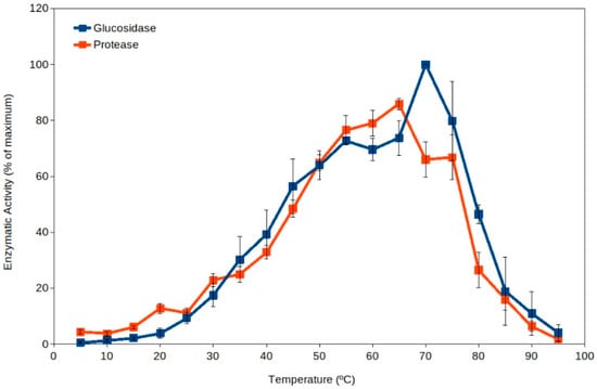 Extracellular enzyme activity in soils over a broad range of temperatures (5 °C to 95 °C). Maximum activity was observed at temperatures in the thermophilic microorganisms range (55 °C–75 °C). Data averaged from Gonzalez et al. []. Blue squares, glucosidase; red squares, protease. Error bars, one standard deviation.