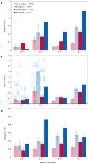 Decay rate of natural extracellular enzymes in soils at different temperatures, 20 °C (light colors) and 60 °C (dark colors), corresponding to the mesophilic (blue) and thermophilic (red) microorganisms, respectively, over a wide spectrum of water contents (water activity, aw) for 3 different enzyme activities: (A), glucanase; (B), phosphatase; (C), protease. High decay rate indicates short persistence, and low decay rate shows long persistence. Data averaged from Gomez et al. []. Error bars, one standard deviation.