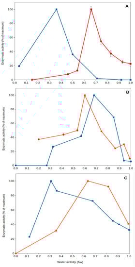 Natural extracellular enzyme activity from Southeastern Spain soils versus water activity. A couple of examples showing optimum extracellular enzyme activity under severe desiccation. Red squares and lines, soil samples collected from Coria del Rio (Seville); blue squares and lines, soil samples collected from Benaocaz (Cadiz). (A), glucanase; (B), phosphatase; (C), protease. Data extracted from Gomez et al. []. Error bars, one standard deviation.