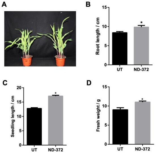 B. japonicum treatment promotes maize growth. (A) The growth situation of maize. (B) Root length; (C) Seedling length; (D) Fresh weight. Note: ND-372, B. japonicum soaking groups; UT, without B. japonicum soaking groups; the significant differences are marked by stars (Student’s t-test, p < 0.05).