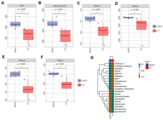 In order to explore the relationship between soil bacteria and maize growth, we conducted bacteria alpha diversity analysis. Compared with the UT, the observed species values and Chao1 diversity index were higher in the ND_372 groups (Figure 3A,B), indicating that ND_372 had a greater richness. The Shannon and Simpson’s diversity indexes were increased significantly, indicating that bacterial community diversity and evenness in the ND_372 groups were higher than that in UT groups (Figure 3C,D). In addition, Pielou’s evenness and Good’s coverage index were also increased significantly, which indicated a higher level of diversity evolution and evenness (Figure 3E,F). To evaluate the contribution of bacteria, genus composition analysis was performed. The results showed that the abundance of many plant growth promotion-related bacteria, such as subgroups_6 and KD4-96, increased significantly (Figure 3G). The results suggested that soaking seed in B. japonicum may promote the growth of maize by altering the abundance of bacteria.