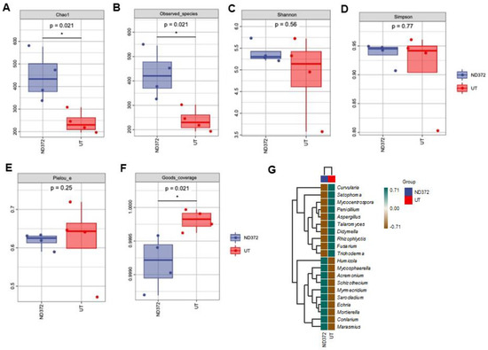 Alpha diversity index, species differences and marker species of rhizosphere soil fungi. (A) Chao1; (B) Observed_species; (C) Shannon; (D) Simpson; (E) Faith_pd; (F) Pielou_e. Each panel corresponds to an alpha diversity index, identified in the gray area at the top. In each panel, the abscissa is the group label, and the ordinate is the value of the corresponding alpha diversity index. (G) Species differences and marker genera of rhizosphere soil fungi. The samples were clustered according to the Euclidean distance of genera composition data (the default clustering algorithm) via UPGMA, and arranged according to the clustering results by default. The significant differences are marked by stars (Student’s t-test, p < 0.05).
