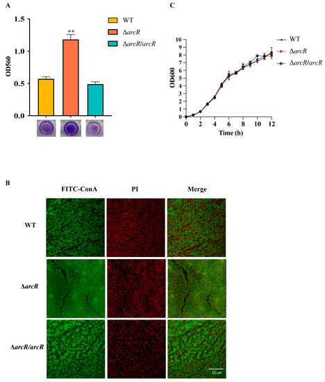 3.2. Deletion of arcR Increased Biofilm Formation in S. aureus