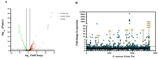 The regulation of ArcR in S. aureus. (A) Volcano plot depicting gene transcripts to be differentially expressed between the WT and ΔarcR mutant. Red and green dots represent significantly upregulated and downregulated proteins, respectively. (B) Genes of biofilm and virulence that were remarkably upregulated in the ΔarcR mutant.