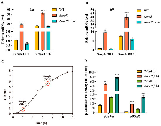 ArcR negatively regulates the transcription of hemolytic genes. The transcript levels of hla (A), hlb (B) in the WT, ΔarcR mutant, and arcR complementary strains at different growth phases. (C) The plot with the sample collection points OD1 and OD6. OD1 and OD6 represented OD600 = 1 and OD600 = 6. (D) β-Galactosidase activities of hla and hlb promoter in the WT and ΔarcR mutant strains. Bacteria cells were collected at 4 and 8 h. Error bars represent the standard errors of the means of three biological replicates. *** p < 0.001, analyzed with one-way ANOVA.