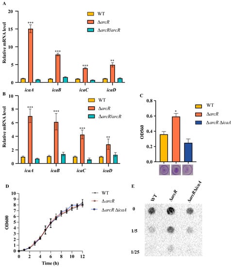 To verify the RNA-seq results, the transcript levels of genes of the ica operon were measured using a qRT-PCR with RNA extracted from the WT strain and its isogenic ΔarcR mutant in planktonic bacteria and biofilm. The transcript levels of icaA, icaB, icaC, and icaD were upregulated in the ΔarcR mutant not only in planktonic bacteria, but also in biofilm (Figure 5A,B). To determine whether ArcR affects biofilm formation by regulating the expression of the ica operon, the icaA mutant was constructed from the ΔarcR mutant. Biofilm production was evaluated in the WT, ΔarcR mutant, and ΔarcR ΔicaA double mutant and was detected using 96-well microtiter plate assays. Biofilm production was lower in the ΔarcR ΔicaA double mutant than in the ΔarcR mutant (Figure 5C). There were no significant differences in the growth rates between the WT, ΔarcR mutant, and ΔarcR ΔicaA double mutant (Figure 5D).