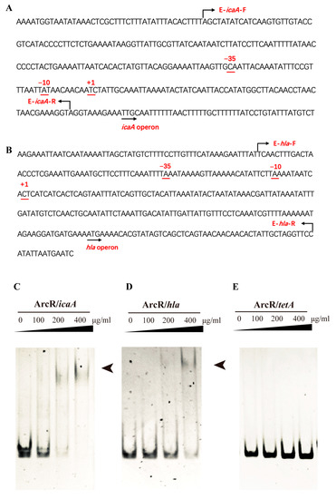 ArcR regulated the expression of the ica operon and hla by directly binding to their promoter regions. The promoter sequence of the icaA and hla and the locations of the probes were marked by arrows (A,B). The interactions between ArcR and the DNA fragments of their promoter regions were detected with EMSA. ArcR was incubated with the ica promoter region (C), ArcR was incubated with the hla promoter region (D), and ArcR was incubated with the tetA promoter region (E) at 37 °C for 30 min. The mixtures were electrophoresed on 8% native polyacrylamide gels and the bands were imaged under UV light after EB staining.