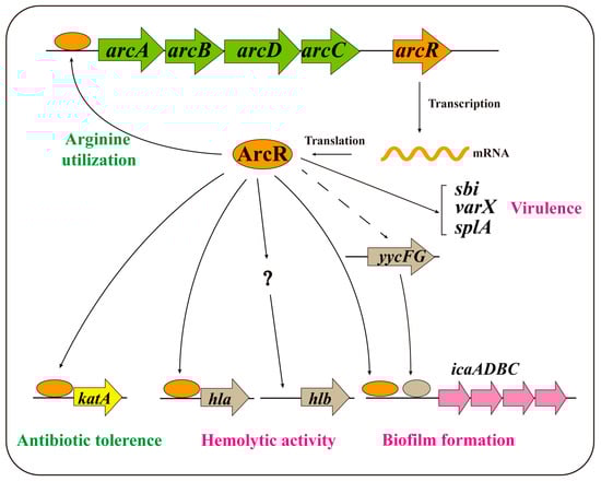 The ArcR regulatory model in S. aureus. ArcR binds to the promoter region of the arcABDC operon and activates its transcription. ArcR may bind to the yycFG promoter region and regulate its expression under certain conditions. Our previous study showed that ArcR contributed to tolerance to fluoroquinolone antibiotics by regulating katA in S. aureus. Furthermore, ArcR could bind to the promoter regions of ica operon and hla by directly binding to their promoter regions. ArcR could also participate in the regulation of the virulence-associated genes sbi, vraX, and splA.