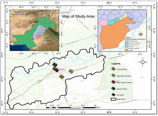 Fresh citrus peels were collected from the local juice corners of five different locations in Bahawalpur i.e., Airport Road (29.3509° N, 71.7109° E), Islamia University, Baghdad ul Jadeed campus (71.7593° N, 71.71120° E), Karachi Morh (29.3833° N, 71.0333° E), Railway station (29.395721° N, 71.683334° E) and SS world park (29.3937° N, 71.6618° E) (Figure 1).