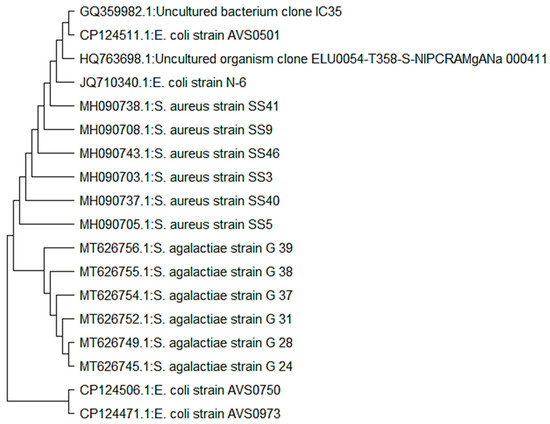 The essential oil was tested against three bacterial strains: Staphylococcus aureus (MH090705), Escherichia coli (JQ710340) and Streptococcus agalactiae (GQ994974). Bacterial cultures were maintained on agar nutrient media. The phylogenetic tree of test species was constructed using MegaX software (Figure 3).