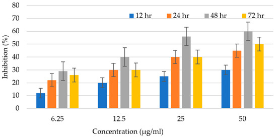The efficiency of C. sinensis peel oil as an antileishmanial agent was observed for 72 h and mentioned as % inhibition (Figure 6). Promastigotes number were counted in both experimental and control groups at various time intervals (12, 24, 48, and 72 h). After amendment with multiple doses of the citrus oil, the parasite number was counted in treated and control trials at consistent time duration extending from 12–72 h. The anti-leishmanial potential is enhanced with the rising concentration of oil. The antileishmanial potential was examined to be 14% at 6.25 μg/mL, 20% at 12.5 μg/mL, 25% at 25 μg/mL, and 30% at 50 μg/mL, in the initial incubation for 12 h. C. sinensis peel oil displayed antileishmanial efficiency of 30%, 40%, 55%, and 60% at 6.25 μg/mL, 12 μg/mL, 25 μg/mL, and 50 μg/mL, respectively, after 48 h of incubation. After that, there was a slight decrease in activity. Afterward, a little decrease in potential was observed. Citrus oil has the ability of ROS production, which destroys pathogens by creating holes in the cell wall and affects the physical properties of the cell membrane, causing the bursting of the membrane and leakage of intracellular constituents. It is also documented that Leishmania is extremely sensitive to these ROS, and the medicine that would produce ROS will be acknowledged as an effective antileishmanial agent. Another important factor that can lead to a good performance of antiparasitic activity is either the synergism of the major chemical constituents found in the essential oil or the presence of other constituents that can also be active at even lower concentrations [28]. Previously scientists have described that α-pinene has recognized leishmanicidal activity against L. brasiliensis though this terpene is at a concentration below 10% [29]. Furthermore, the reports have shown that β-caryophyllene (14.0%) is also vigorous against Leishmania genus [30]. The substantial findings of our research thus absolutely show that citrus oil may be a capable agent for leishmaniasis treatment.