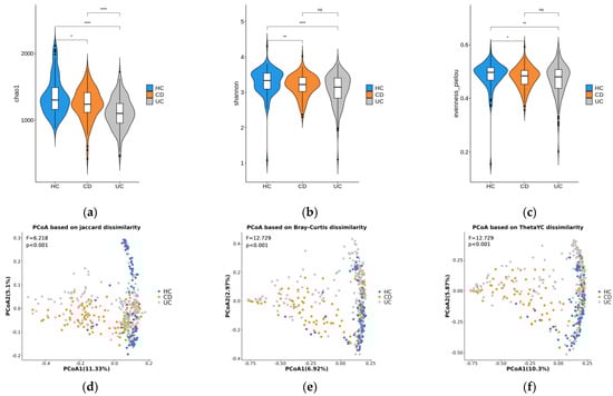 The alpha diversity analysis revealed that HC individuals had a significantly richer microbiome compared to the UC patients (p < 0.01) and the CD patients (p < 0.05), as shown in Figure 1a–c. However, there were no significant differences in alpha diversity indices between CD and UC, except for Chao1.