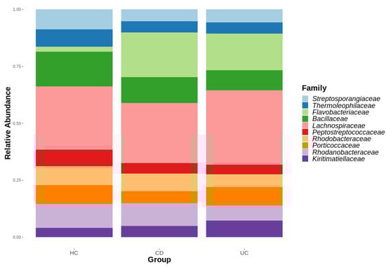 These results from the beta diversity analysis align with the taxonomic distribution depicted in Figure 2. The Lachnospiraceae family was the most abundant family across all three groups. Although the HC group exhibited a significantly lower abundance of the Flavobacteriaceae family compared to IBD, no substantial taxonomic differences were observed among the IBD subgroups at the family level. The top 10 family groups are listed based on their abundance.