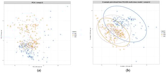 Principal component analysis (a) and PLS−DA (b) plots of saliva microbiome data. Normalized log-transformed abundance values from ANCOM−BC were used.