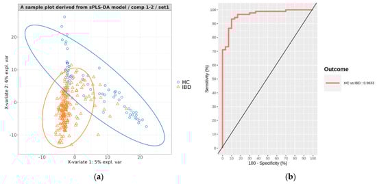 (a) A representative PLS projection onto the subspace spanned by the two components of the sPLS−DA model developed for classifying IBD vs. HC. The ellipses for each class represent the 95% confidence levels of discrimination. (b) Area under the receiver operating characteristic curve (AUROC) for the predictions on the validation set of the representative model.