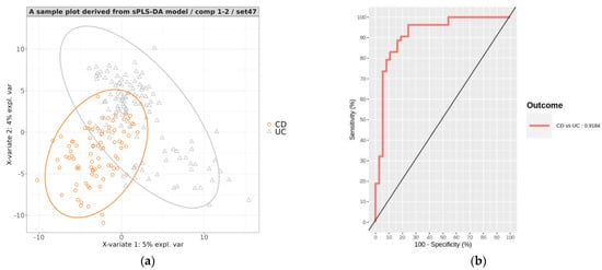 (a) A representative PLS projection onto the subspace spanned by the two components of the sPLS−DA model developed for classifying CD and UC. The ellipses for each class represent the 95% confidence levels of discrimination. (b) Area under the receiver operating characteristic curve (AUROC) for the predictions on the test set of the representative model.