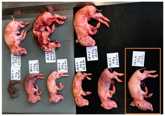 For each transmittal, information on the parity of the corresponding sow, total litter size (including those not sent in live-born animals), and vaccination strategies were noted. All litters were photo documented, and from all fetuses, the crown-rump length, bodyweight, phenotypical appearance (mummy, stillborn-macerated, and stillborn-fresh), and sex were documented. An exemplary depiction is presented in Figure 1. Detailed information on the herd size, vaccination against PPV1, PCV2, and Leptospira spp. of the sows, as well as sampled fetuses and the farm, is available in Supplementary File S1.