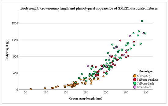 Out of a pool of 358 fetuses with a crown-rump length of 232.35 mm (±54.22 mm), 158 fetuses with a mean crown-rump length of 233.98 mm (±55.07 mm) were enrolled in this examination. The distribution of these fetuses on different phenotypes is shown for all (n = 358) and for the study population (n = 158) in Table 1. A detailed view of the crown-rump length, bodyweight, and phenotypical appearance of single fetuses is provided in Figure 2.