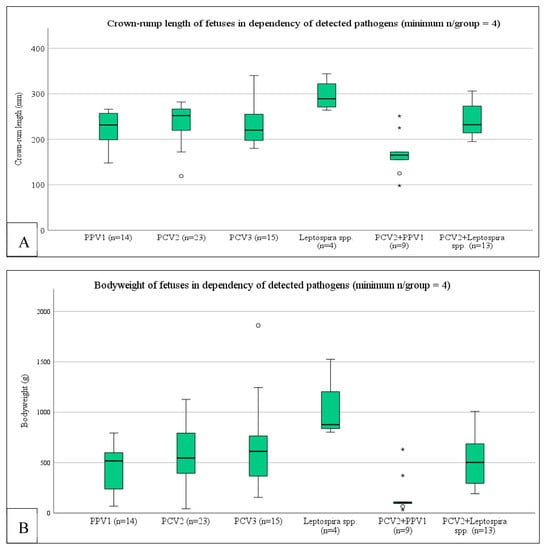 In terms of coinfections, it is well known that double infection with PPV1 and PCV2 leads to an increase in PCV2-associated clinical and pathomorphological changes and higher PCV2-DNA loads in the tissue of young pigs under controlled conditions [,,]. In terms of reproductive parameters, a possible effect in sows was demonstrated in an experimental setting [], when SMEDI-like appearances of litters from PCV2-infected non-PPV1 + erysipelas-vaccinated sows were observed, whereas litters from PCV2-infected sows vaccinated against PPV1 and erysipelas did not show noticeable problems. However, less is known about the occurrence of coinfections with different pathogens in the case of SMEDI and its possible effects on the affected litters. In the present study, we examined SMEDI-litters that were transferred for diagnostic purposes from German piggeries for the presence of PPV1, PCV2, PCV3, and Leptospira spp. by q-PCR. All litters were photo-documented, and crown-rump length and bodyweight were noted. Furthermore, questionnaire-based farm-specific information concerning vaccinations, parity of the dams, and litter size was evaluated. The gained data was set in correlation, and pathogen associations were determined.