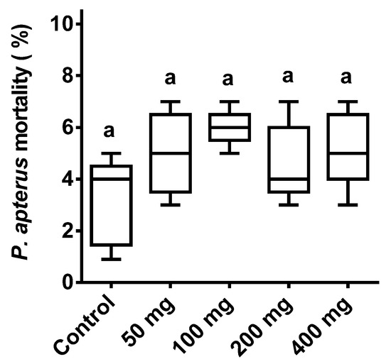 P. apterus’s survival remained unaffected (p < 0.001; F = 2.1) by the different doses of ASF treatment. The control exhibited 5% mortality, and the highest mortality of 6–7% occurred with the 400 mg ASF treatment. All treatments were non-significantly different in comparison to the controls (Figure 2).