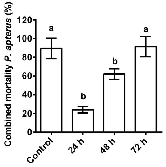 The combined effect of nematode and ASF treatments on host P. apterus. Percent mortality of P. apterus with combined treatments (ASF-treated nematodes; topical application) at 24, 48, and 72 h. The controls were water-treated (topically applied) and had mean representatives for all time points. Results are expressed as means ± standard deviation (SD). Data represent the means of three replications (n = 50). Values (represented as a, b) with different superscripts are significantly different (p < 0.05).