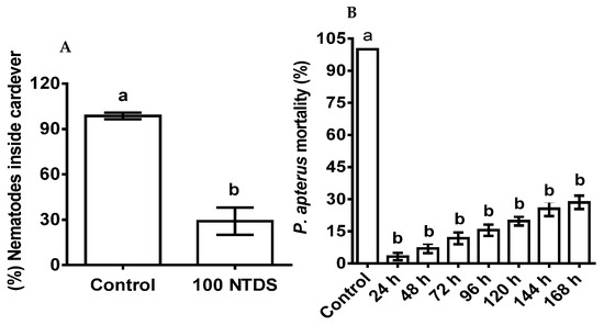 The deterrent effect of nematodes, infectivity, and mortality of P. apterus pre-treated with ASF. (A) Percent nematode inside a cadaver of 100 mg of pre-treated P. apterus after 10 days. (B) (%) Mortality of P. apterus pre-treated with ASF after 7 days of nematode exposure. Controls (water-treated) are the mean representatives at different time points. Results are expressed as means ± standard deviation (SD). Data represent the means of three replications (n = 30). Values (represented as a, b) with different superscripts are significantly different (p < 0.05).