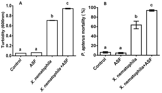 In vitro tests were performed by injecting X. nematophila into P. apterus (%), which showed similar results. Significantly increased mortality was observed for the X. nematophila and ASF+ X. nematophila-treated P. apterus when compared to the control and ASF treatment groups (Figure 5B; p < 0.001).