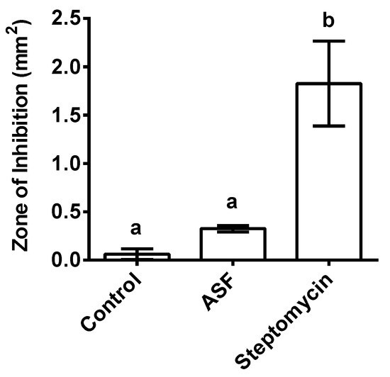 Effect of X. nematophila growth on ASF and positive control streptomycin after 3 days of incubation on NA (nutrient agar) plates. Control represents X. nematophila growth on NA. The bar graphs are representative of 100 mg of ASF and 30 µg of streptomycin on a paper disc with a size of 0.5 mm placed on NA plates. Each treatment included five replicates (n = 5). Points in the bar graphs represent means ± SD. (Dunnett’s test). Values (represented as a, b) with different superscripts are significantly different (p < 0.05).
