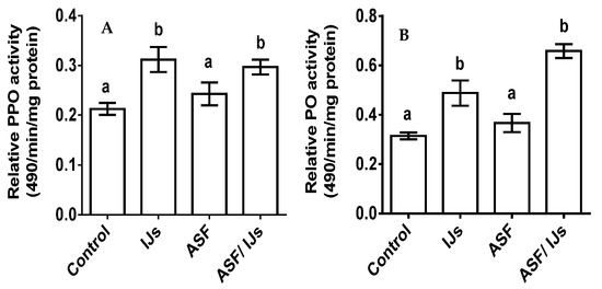 (A) ASF effect on the pro-PO activity of P. apterus’s hemolymph. (B) ASF effect on the PO activity of P. apterus’s hemolymph. Control represents water treatment. Results are expressed as means ± standard deviation (SD). Data represent the means of three replications (n = 30). Values (represented as a, b) with different superscripts are significantly different (p < 0.05).