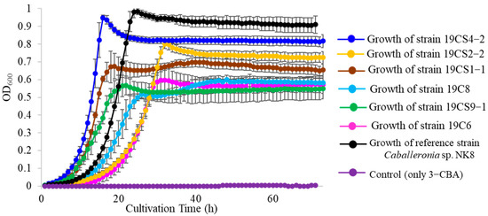 The cell growth of isolates 19CS4-2, 19CS2-2, 19CS1-1, 19CS9-1, 19C8 and 19C6 with reference Caballeronia sp. NK8, in basal salt medium (BSM) supplemented with 5 mM 3-chlorobenzoate (3-CBA). The data are represented as the mean ± standard deviation of three independent experiments. Error bars that are not visible lie within the data point.