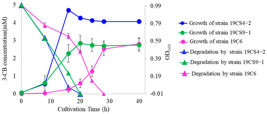 The growth and 3-chlorobenzoate (3-CBA) degradation rates of strains 19CS4-2, 19CS9-1 and 19C6 in BSM supplemented with 5 mM 3-CBA. The data is represented as a mean ± standard deviation of three independent experiments. Error bars that are not visible lie within the data point.