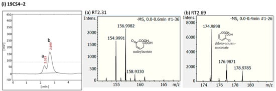 HPLC analysis revealed two metabolites in all isolates grown on 3-CBA (Figure 3). The two peaks of the isolates were collected 40 h after the start of the incubation period. The mass spectra of the isolates showed deprotonated molecular ions at m/z = 157.02 [M−H]− and m/z = 174.99 [M−H]−. These ions correspond to the molecular ions [M−] at m/z = 158.02 and m/z = 175.99, which are the masses of maleylacetate and chloro-cis,cis-muconate, respectively (Figure 3). The metabolites were found in all isolates, suggesting they might be involved in the 3-CBA degradation pathway. Although the metabolites were found in all strains, the growth characteristics of strain 19C6 were notably different to those of 19CS4-2 and 19CS9-1. Further genomic analyses were conducted to gain a more detailed understanding of the genetic mechanisms underlying the different degradation abilities of these isolates.
