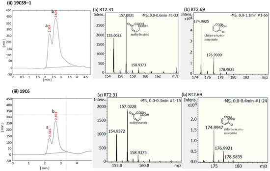 High-performance liquid chromatography (HPLC) and mass spectroscopy (MS) identification of the metabolites during degradation of 3-chlorobenzoate (3-CBA) by (i) 19CS4-2, (ii) 19CS9-1 and (iii) 19C6. The mass spectra show major deprotonated molecular ions at m/z = 157.002 [M−H]− (a) and m/z = 174.99 [M−H]− (b). These compounds were identified as maleylacetate and chloro-cis,cis-muconate, respectively, in all the isolates.