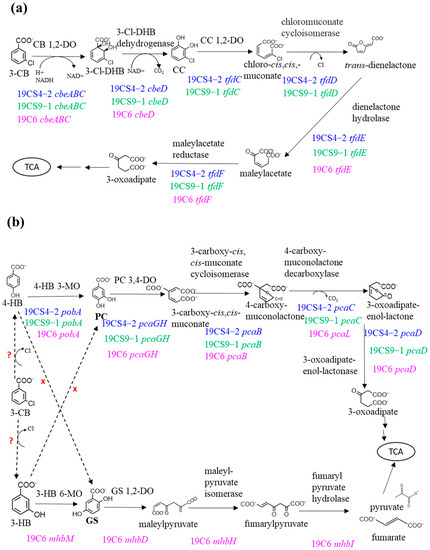 Putative 3-chlorobenzoate (3-CB) degradation via chlorocatechol (CC) ortho-cleavage pathways involved in the isolates (a). Putative 4-HB and 3-HB degradation via PC and GS in the isolates, respectively (b). The strains 19CS4-2,19CS9-1 and 19C6 are colored in blue, green and pink, respectively. The enzyme is unknown in the conversion of 3-CBA to 4 or 3-HB. Abbreviations: 3-CB, 3-chlorobenzoate; 3-Cl-DHB, chloro-3,5-cyclohexadiene-1,2-diol-1-carboxylate; CC, chlorocatechol; DO, dioxygenase; GS, gentisate; HB, hydroxybenzoate; MO, monooxygenase, PC, protocatechuate.