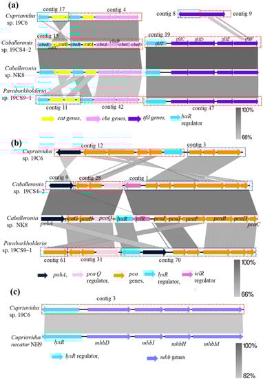 Comparison of strains 19CS4-2, 19CS9-1 and 19C6 involved in 3-CBA degradation via chlorocatechol (CC) (a), compared with corresponding clusters of Caballeronia sp. NK8 genes. Comparison of strains 19CS4-2, 19CS9-1 and 19C6 involved in 4-hydroxybenzoate degradation via protocatechuate (PC) compared with corresponding clusters of Caballeronia sp. NK8 genes (b). Comparison of clusters of strains 19C6 involved in 3-hydroxybenzoate degradation via gentisate (GS) (c), compared with corresponding clusters of Cupriavidus necator NH9 genes. Red and blue borders represent the contig number, where clusters are present in the bacterial genome.