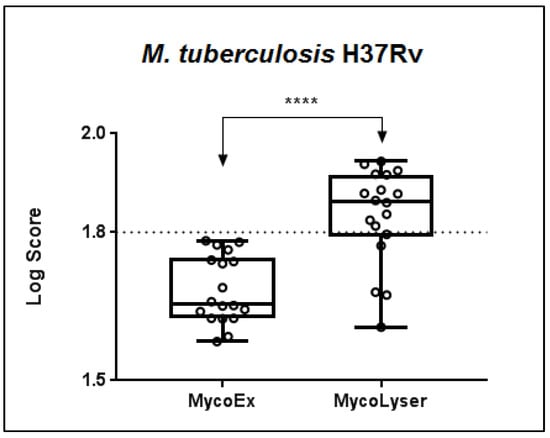 Boxplot of the MALDI Biotyper log(score) results for 18 replicate mass spectra after cell disruption and protein extraction with the MycoEx and MycoLyser protocols. Biotyper analysis was performed with BDAL DB-7311 v.7.0 plus Myco v.5.0 (Bruker Daltonics) databases with 8223 reference mass spectra; **** corresponds to a significant difference with p < 0.0001 (exact value, two-tailed) after Mann–Whitney test. Plotted circles represent MALDI Biotyper log(score) values and dotted line indicates log(score) 1.8 used as threshold of high confidence for mycobacteria identification at species level.