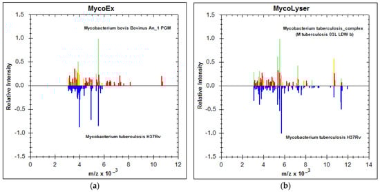 In addition to the increase in log(score) values, the identification of M. tuberculosis was also more accurate, as shown in Figure 2. The MSP generated by the Biotyper with the mean peak frequency of the 18 mass spectra obtained with both MycoEx and MycoLyser protocols were compared with the reference databases (BDAL plus Myco v.5.0), which contain a total of 8223 different bacterial references, 912 of which are reference spectra for mycobacteria, MTC species included. By definition, MSP is the main spectrum profile or reference spectrum of a sample, generated by the Biotyper in a previous step. It is a kind of consensus for the most reproducible spectrum found for a sample, which encompasses some tolerable variation of peaks (mass and intensity) and reflects the typical protein pattern of the sample, to be used for microorganism identification analysis. Comparing the MSP obtained for each of the protocols, MycoEx and MycoLyser, against the database revealed that the MycoLyser MSP’s first hit matched to a reference for M. tuberculosis (M. tuberculosis 03L LDW b) (Figure 2b), as expected, while MycoEx’s most similar match was to a M. bovis reference (Mycobacterium bovis Bovinus An_1 PGM) (Figure 2a).