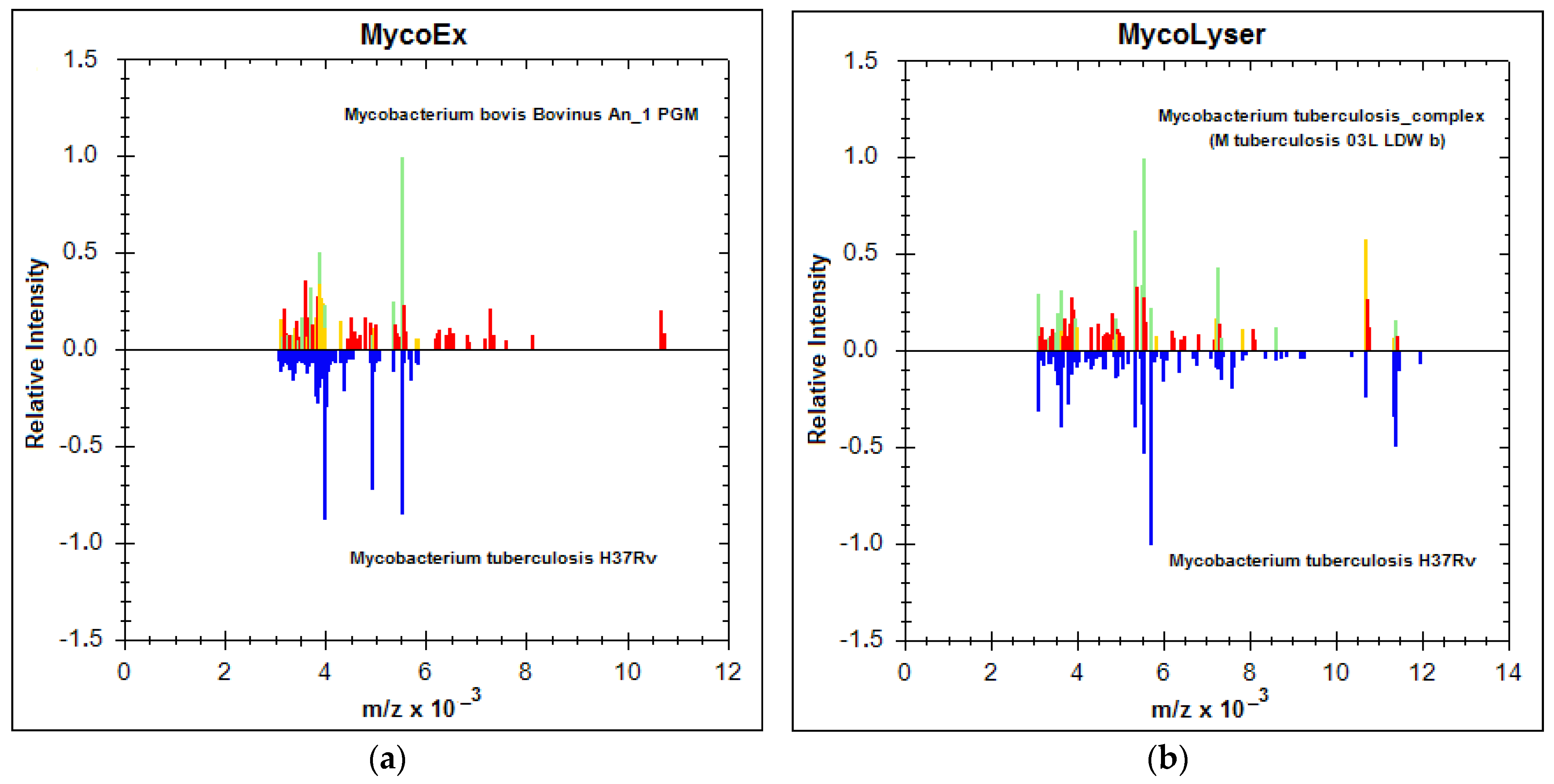 - Mather, C.A.; Rivera, S.F.; Butler-Wu, S.M. Comparison of the Bruker Biotyper and Vitek MS Matrix-Assisted Laser Desorption Ionization–Time of Flight Mass Spectrometry Systems for Identification of Mycobacteria Using Simplified Protein Extraction Protocols. J. Clin. Microbiol. 2014, 52, 130–138. [Google Scholar] [CrossRef]