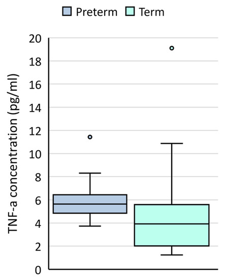 TNF-α concentrations (pg/mL) in mid-trimester amniotic fluid samples collected from women who went on to deliver at term (light blue boxes) or preterm (dark blue boxes).