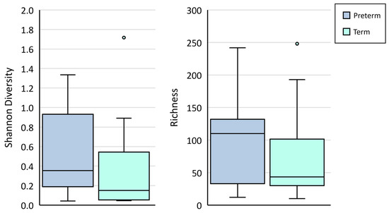 Shannon diversity and richness (number of OTUs) in mid-trimester amniotic fluid samples collected from women who went on to deliver at term (light blue boxes) or preterm (dark blue boxes).