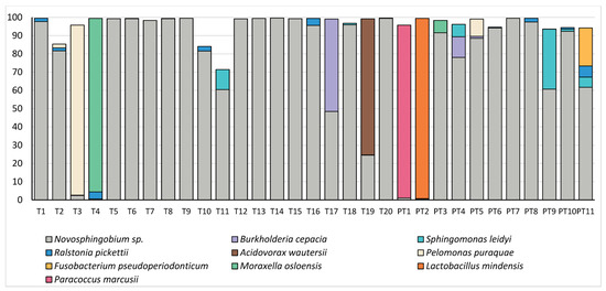 Relative abundances (%) of taxa which made up >0.5% of amniotic fluid bacterial DNA profiles in term (T) and preterm (PT) samples and were not present in extraction controls in high numbers.