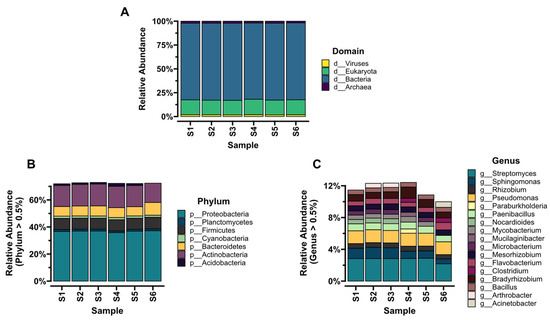 In the metagenomes of soil environments, approximately 87% of the assigned reads were related to bacteria. In all the sites studied, the dominant phylum was Proteobacteria, accounting for 32% (S4) to 43% (S6) of the assigned reads, followed by Actinobacteria for S1, S2, S3, and S6 with 10–12% of the assigned reads, and Acidobacteria for S4 and S5 with 11–18% of the assigned reads. The dominant classes in S1–S5 were Alphaproteobacteria, ranging from 13 to 16% of the assigned reads, and Actinomycetia, with 9–11% of the assigned reads, while the dominant class in S6 was Betaproteobacteria with 16% of the assigned reads. In the case of both the agricultural and non-agricultural environments (S1–S5) and sewage treatment plant (S6), Hyphomicrobiales and Burkholderiales were the dominant orders. The dominant families were Sphingomonadaceae in S1–S3, Nitrobacteraceae in S4 and S5, and Nitrospiraceae in S6. The most numerous genera were Sphingomonas, Streptomyces, Pseudomonas, and Bradyrhizobium (S1–S5), and Nitrospira, Propionivibrio, Pseudomonas, and Acinetobacter in S6 (Figure 1).