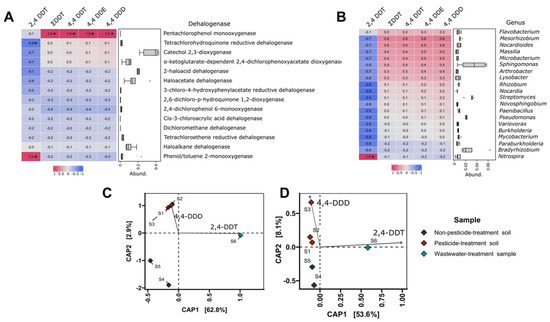 (A) Correlation analysis shows relationship between the content of DDT derivatives and genes encoding dehalogenases. Abundance indicates the amount of each dehalogenase gene in the analyzed environments. (B) Correlation analysis shows relationship between the content of DDT derivatives and taxonomic composition in analyzed environments at the genus level. Abundance indicates the amount of each genus in analyzed environments. (C) Canonical analysis of principal coordinates (CAP) shows relationship between the content of DDT derivatives and presence of proper genes encoding dehalogenases in analyzed environments. (D) Canonical analysis of principal coordinates (CAP) shows relationship between the content of DDT derivatives and the taxonomic composition in analyzed environments at the genus level. The length of each vector line is proportional to the strength of the correlation. (*) indicates a statistically significant result (p-value < 0.05).