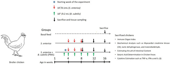 Twenty-one (n = 21) chickens were randomly allocated into three experimental groups. Group 1 (n = 7, Control) chickens were given a baseline diet. Group 2 (n = 7) aimed to assess the effects of orally gavaged sublethal dose S. enterica (107 CFU /0.1 mL) on growth, immunological organ index, and inflammatory marker indices. Group 3 (n = 7) was studied for the effects of chosen probiotic supplements (B. subtilis PM5) (109 CFU /0.2 mL) on S. enterica-challenged chickens. A basal meal was provided to seven chickens in the control group (Figure 1).