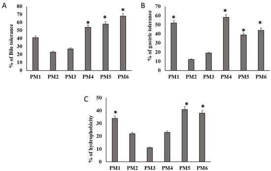 Figure 2A,B show the survival of the isolates in the presence of MRS at 0.45% bile salts and pH 3.0. Four isolates, PM1, PM4, PM5, and PM6 resisted the stress of bile salt, and the count of viable cells was greater than 2.0 CFU/mL after 180 min in the simulated environment. The other two isolates, on the other hand, did not withstand such conditions. Additionally, the Oxgall resistance of the isolates was proven, and they were able to live after 3 h. At pH 3.0, four isolates had considerably higher viability. After 3 h of incubation, PM1, PM4, PM5, and PM6 showed a significant growth increase. The selected four isolates all had viable cell counts that were more than 30% higher than the set baseline levels (Figure 2A,B).